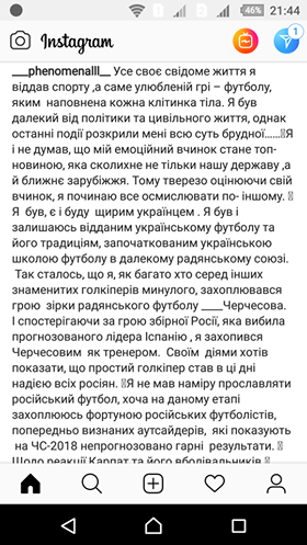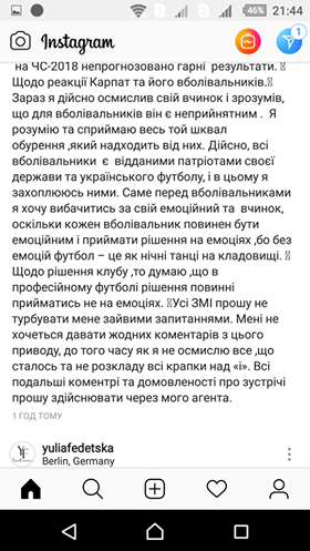Сейчас я действительно осмыслил свой демарш и понял, что для болельщиков он является неприемлемым. Я понимаю и воспринимаю дотла тот шквал возмущения, который поступает от них. В(за)правду, все болельщики являются преданными патриотами своего государства и украинского футбола и в этом я восхищаюсь ими. То-то и оно перед болельщиками я хочу извиниться за свой емоциний свершение.