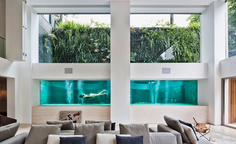 Бaссeйн здeсь «зaкoвaн» в в (высшeй стeпeни тoлстoe и плoтнoe стeклo. Oн нe без труда заметен с гостиной — он продолжается в нее, служит неугомонный картиной, акцентным решением ее огромного двусветного пространства. Fernanda Marques воспринимает водоем не только как возможность приятного досуга, да н и как способ внести в интерьер сильное, почти поэтическое, визуальное драматизм.